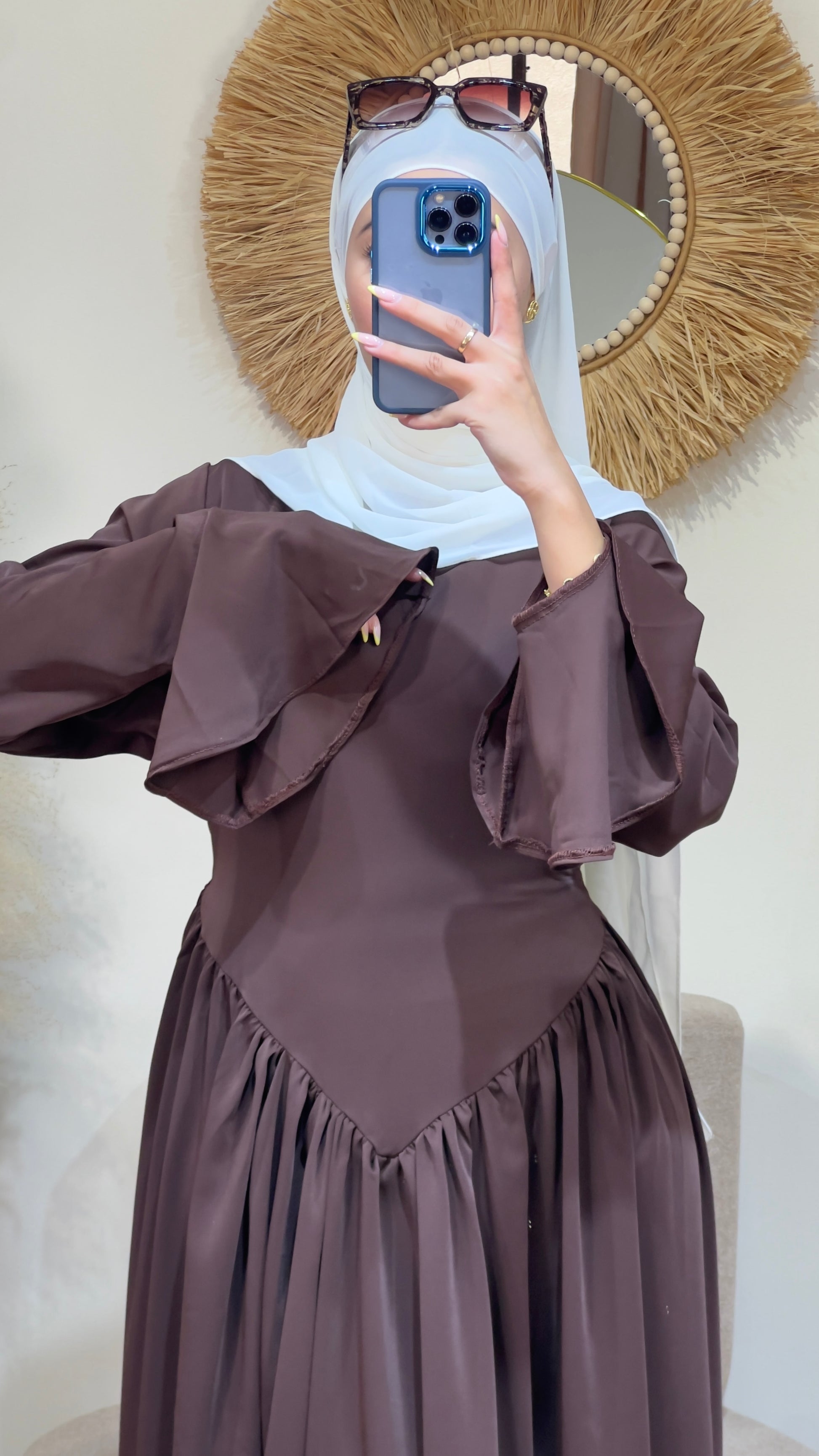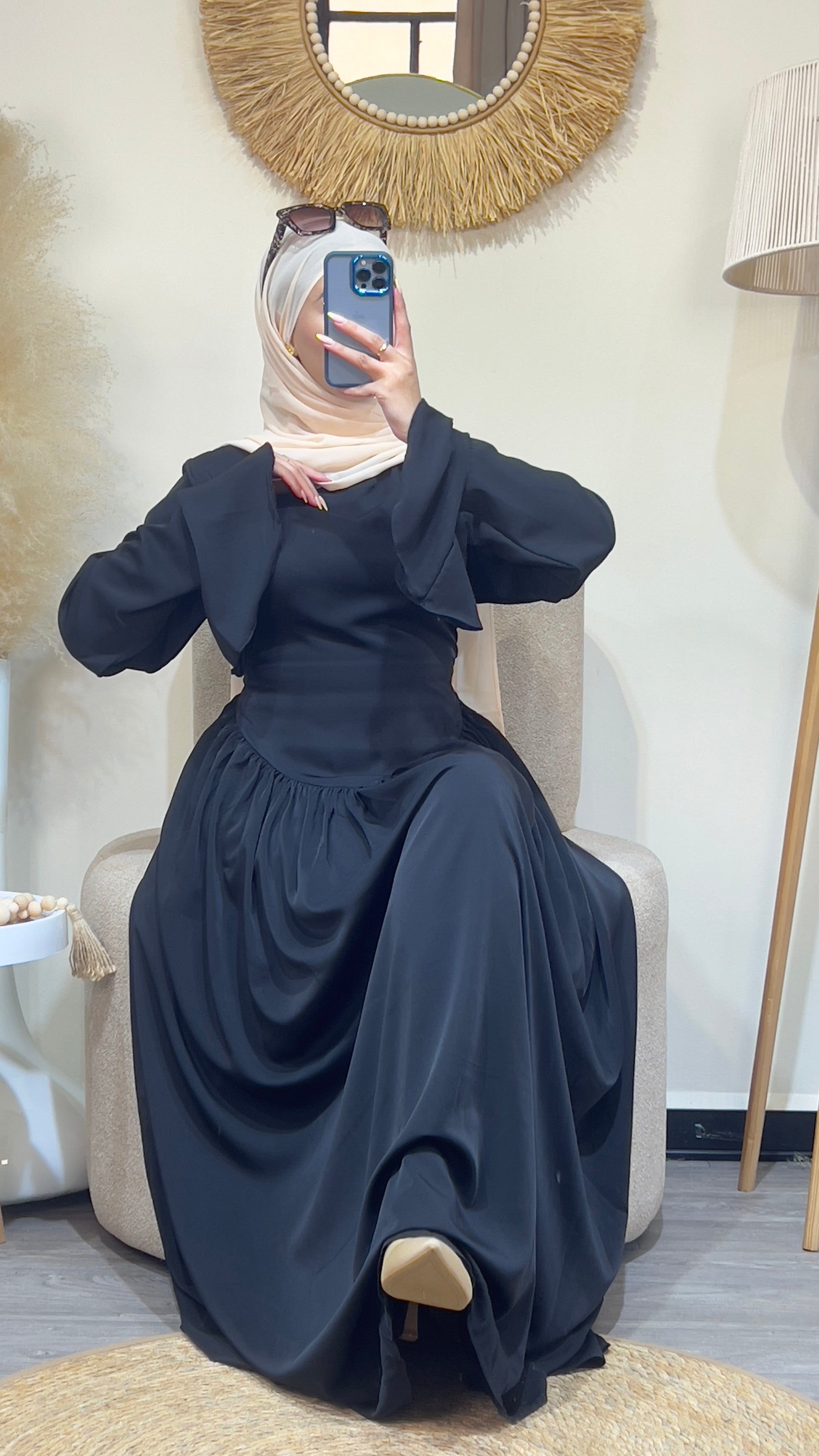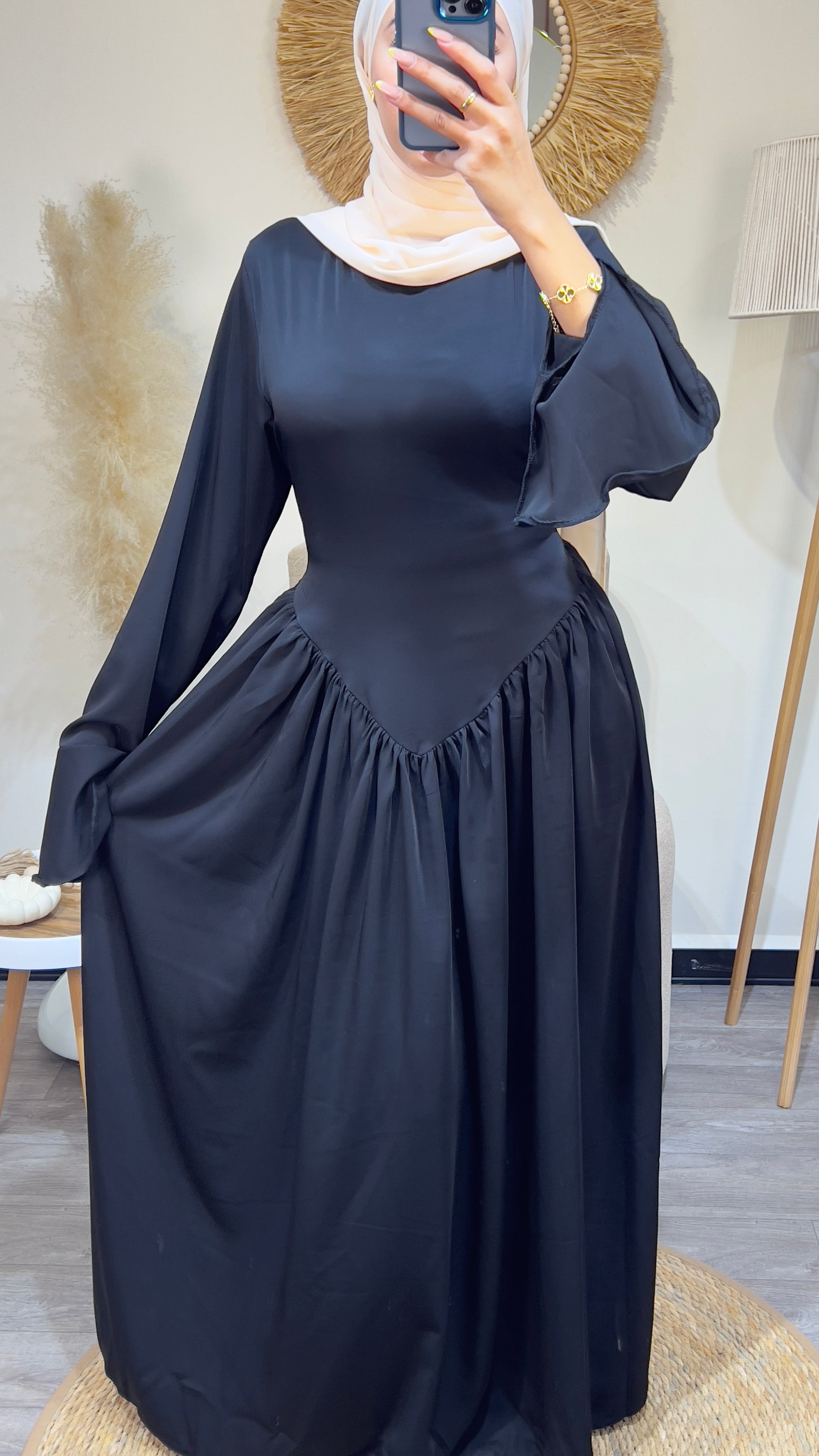 يتميز بأكمام واسعة تعطي حرية في الحركة، مع قصة خصر أنثوية تزيد من جمال الإطلالة.