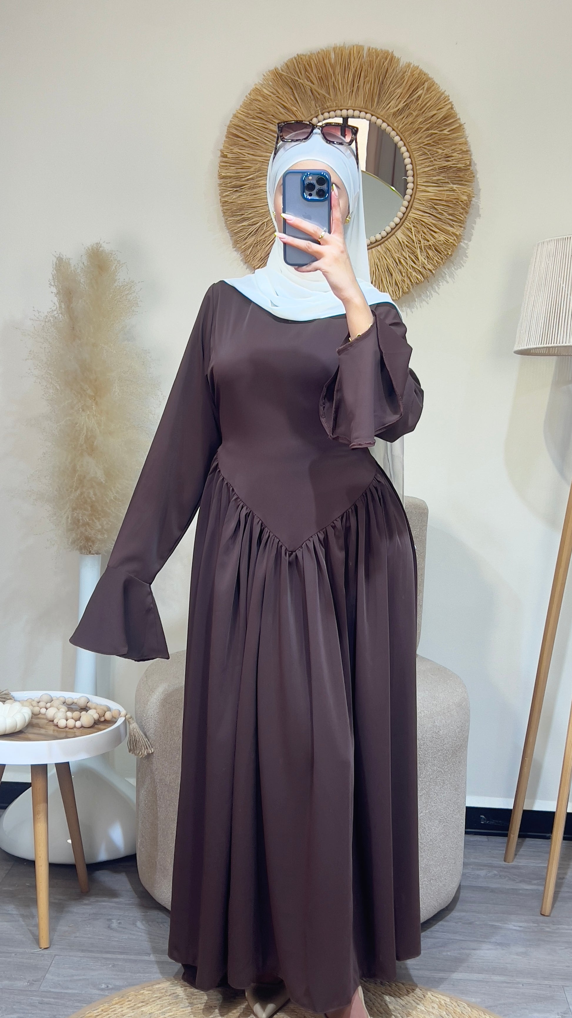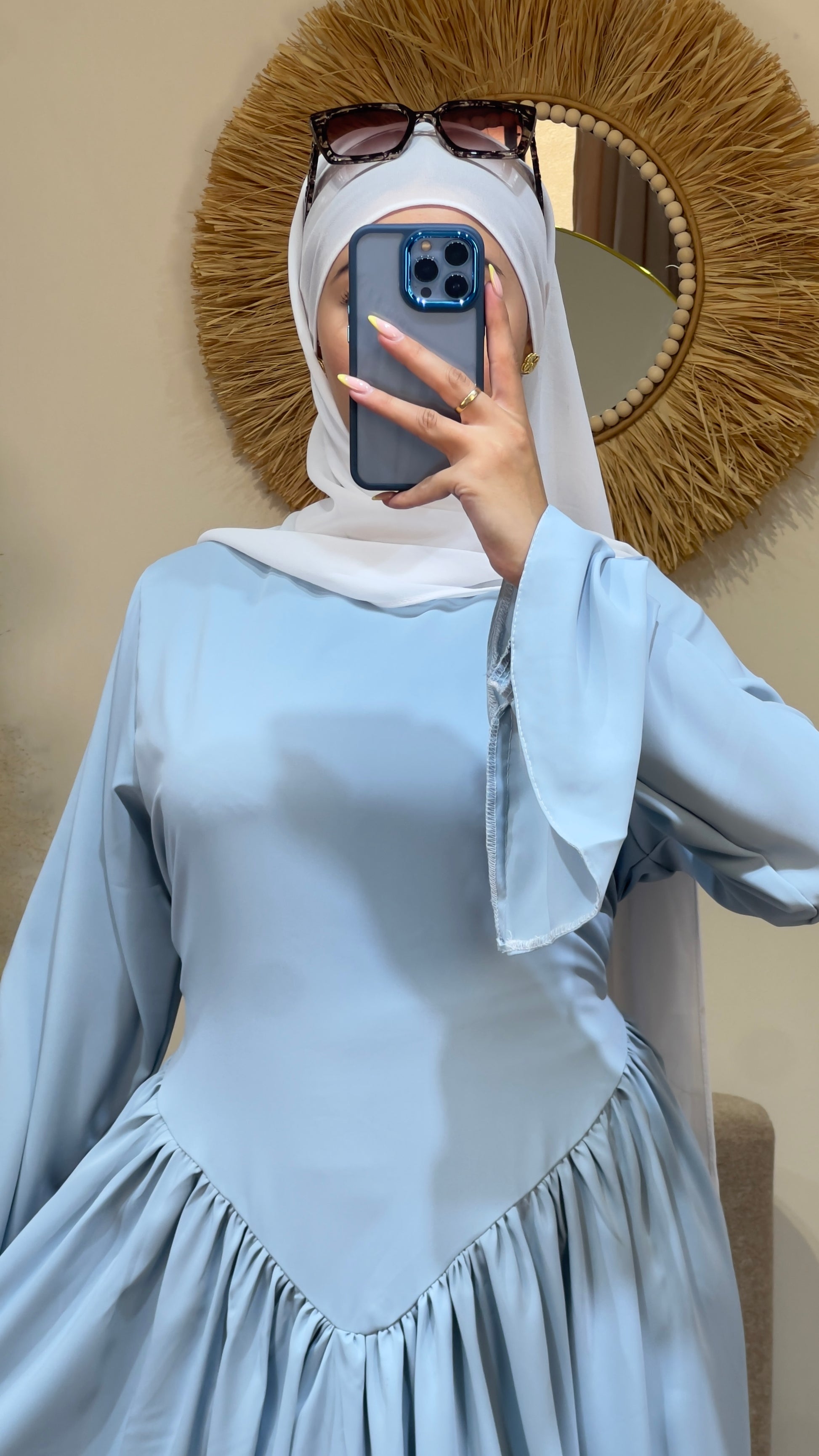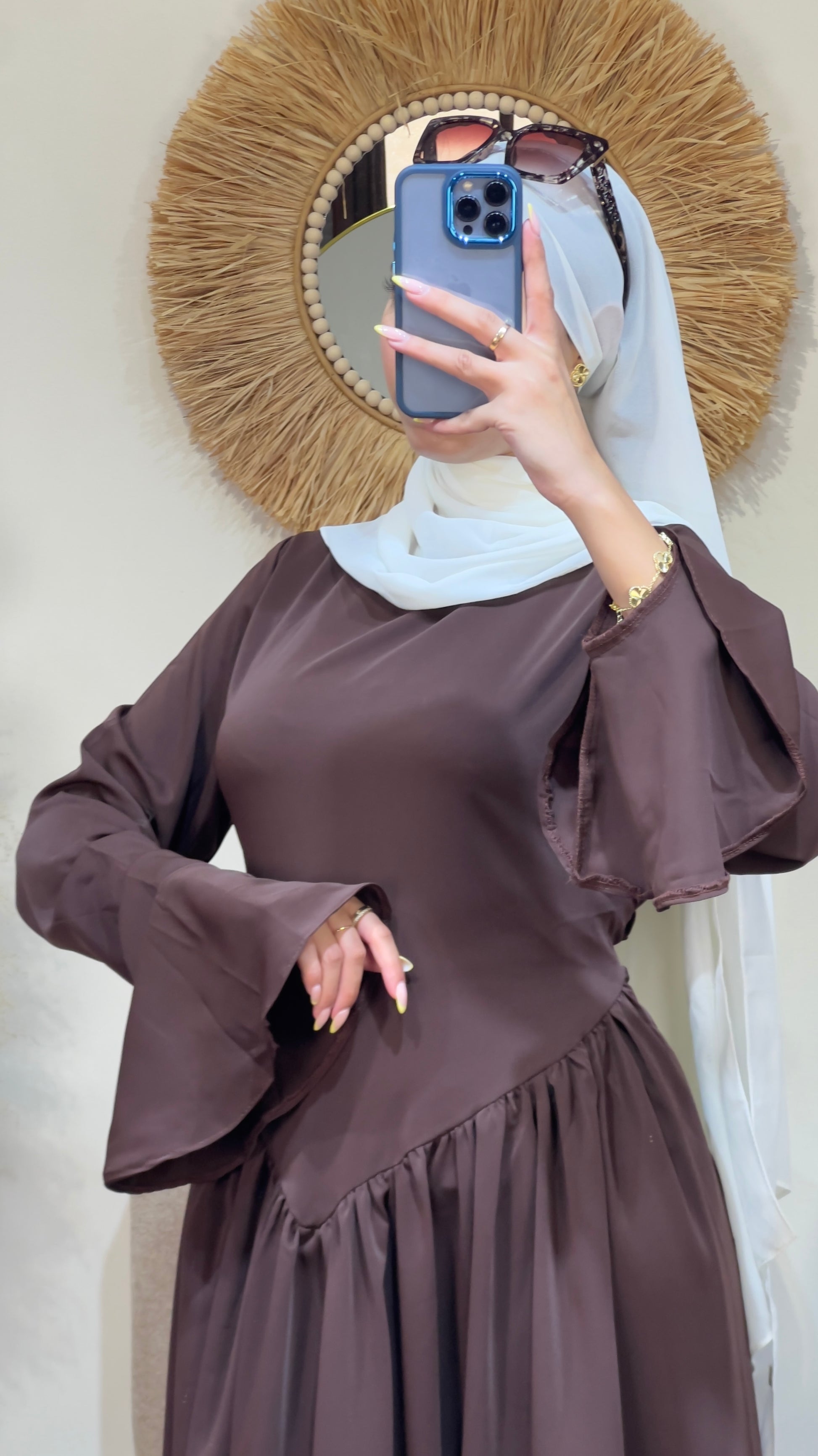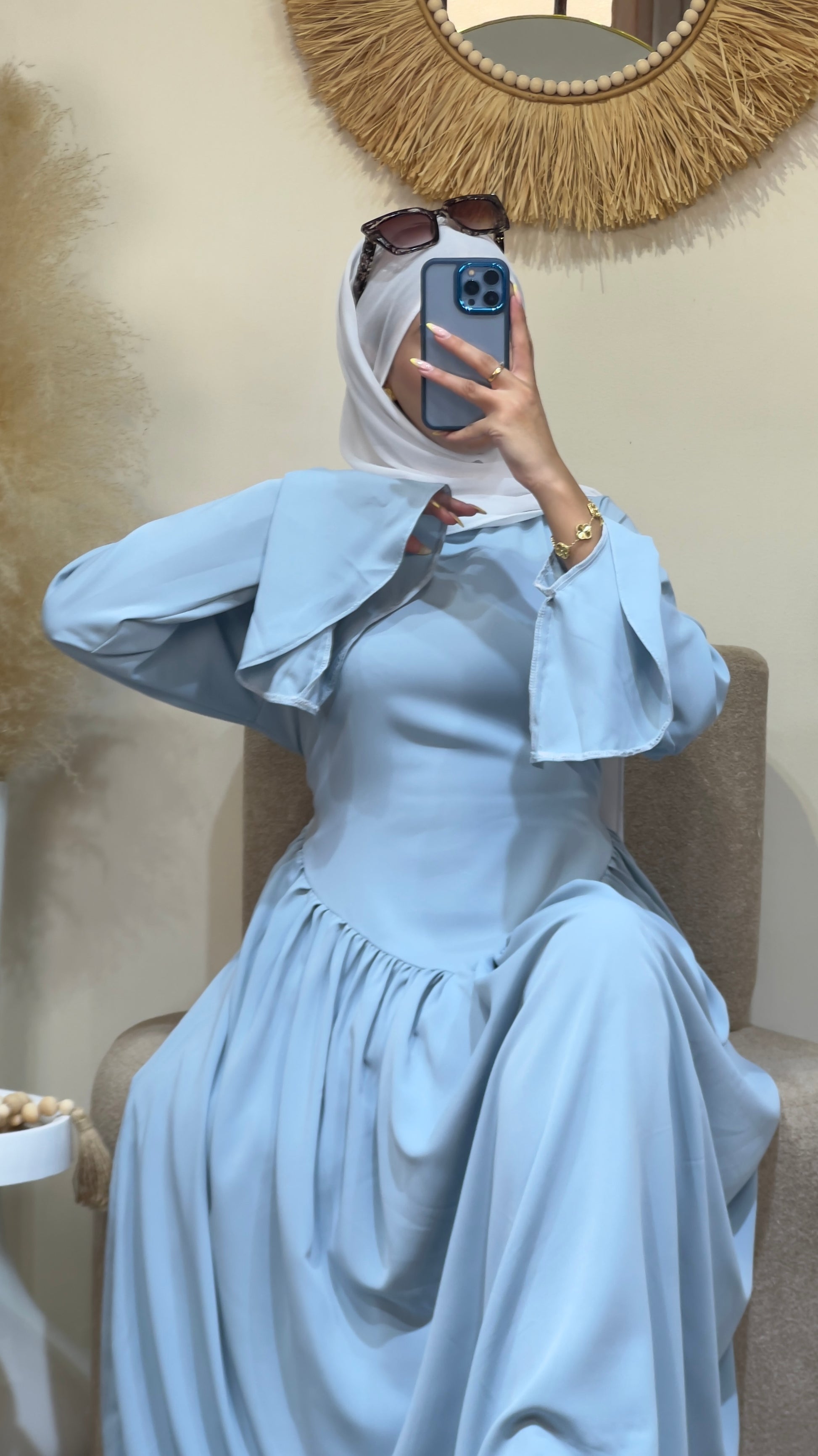 يتميز بأكمام واسعة تعطي حرية في الحركة، مع قصة خصر أنثوية تزيد من جمال الإطلالة.